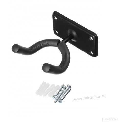 Модель предназначена для подвешивания гитары на стене. Держатель представляет из себя пластину с крюком на коротком стержне. Держатель подходит для любых моделей гитар, с разной шириной и формой грифа. Продуманная конструкция позволяет надёжно и безопасно закрепить гитару или бас-гитару, не повредив и не поцарапав её. Держатель выполнен из прочных материалов. Закрепляемая на стене пластина имеет прочный металлический каркас. Чтобы гриф гитары не поцарапался, часть держателя, контактирующая с инструментом, изготовлена из мягкого износостойкого материала. Представленная модель чёрного цвета. В комплекте поставляется всё необходимое для монтажа.