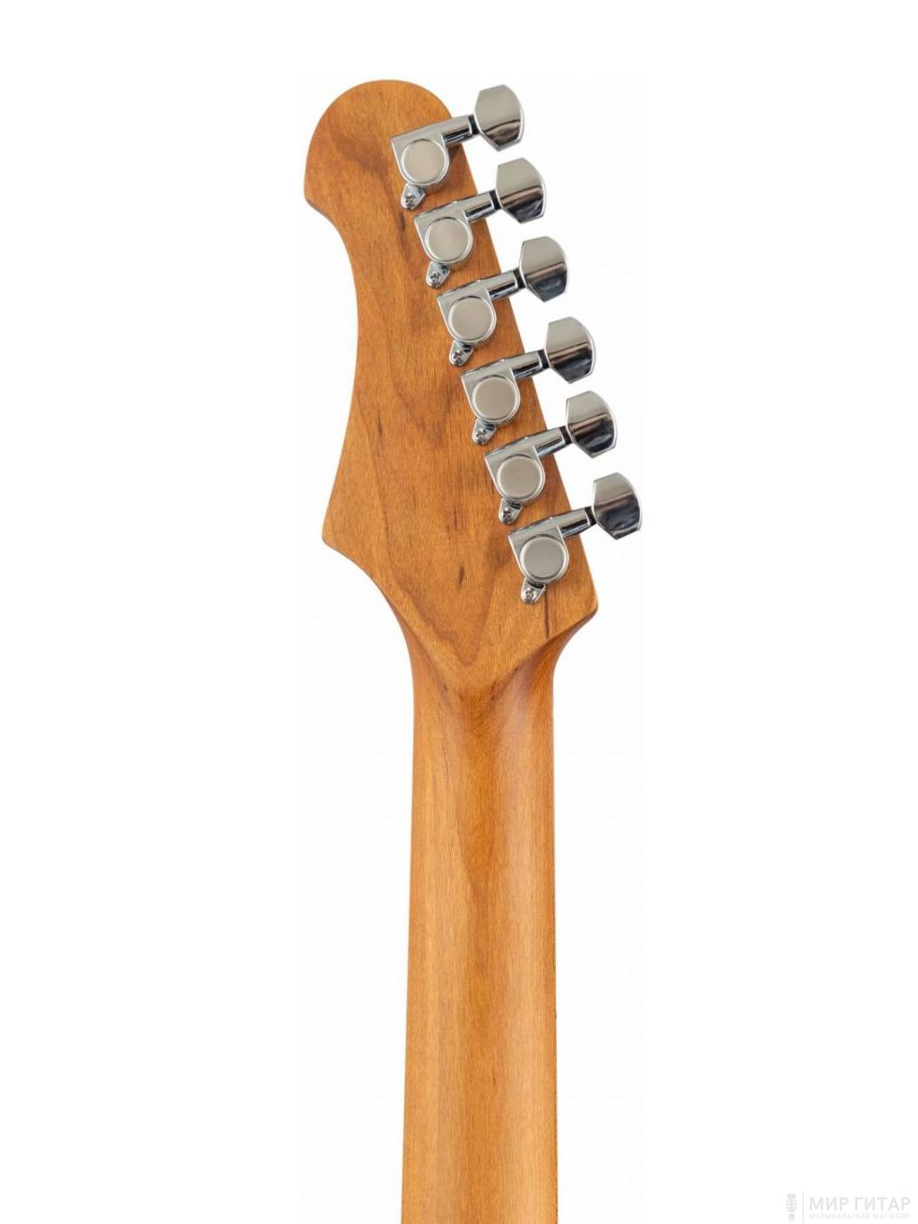 Гриф и накладка на гриф выполнены из печеного клена (roasted maple). При такой обработке поры дерева максимально сжимаются и в процессе использования вода уже не будет выходить, ваша накладка не сожмется и лады не повылазят вне зависимости от влажности и смены температуры. Плюс такое дерево выглядит очень красиво.