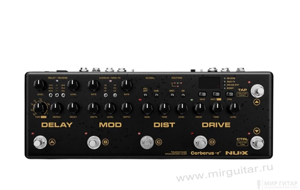 Модули DELAY, DIST и DRIVE предлагают разнообразие тракта передачи сигнала, что удовлетворит самого взыскательного пользователя.Настройка в реальном времени. Необходимо подкорректировать звучание на лету? С процессором Cerberus это не является проблемой, так же как и с обычной педалью. В 32 банках памяти может быть сохранено до 128 предварительных настроек: по 4 пресета в один банк. Банк выбирается нажатем переключателей TAP и CTRL, нужный пресет — нажатием переключателей A/B/C/D.
