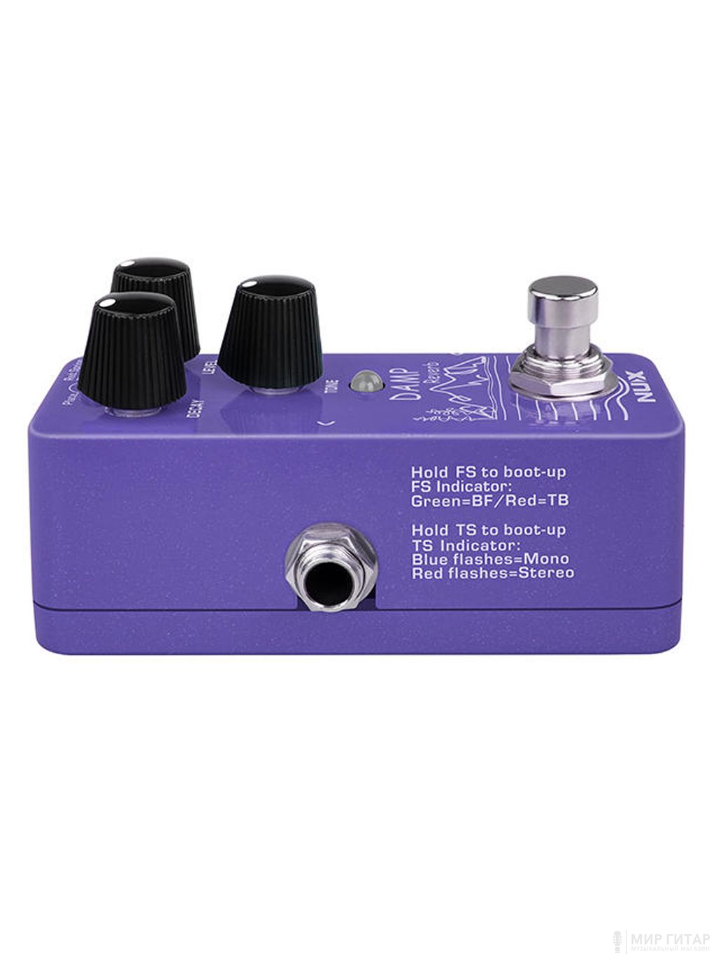Damp Reverb предлагает схемы True-bypass и Buffer-bypass (Trails), просто удерживайте переключатель, чтобы включить педаль (не подключайте USB). Индикатор ножного переключателя покажет вам состояние схемы обхода. (Если при загрузке педали индикатор FS мигает "зеленым" = BF, "красным" = TB.)