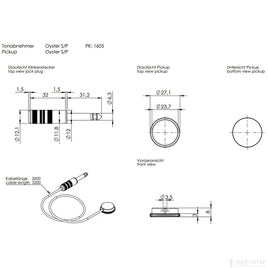Модель разработана для внешней установки на корпус инструмента, снабжена прочным никелированный корпусом. Поставляется в комплекте с кабелем 3м со штекером 6,35мм.